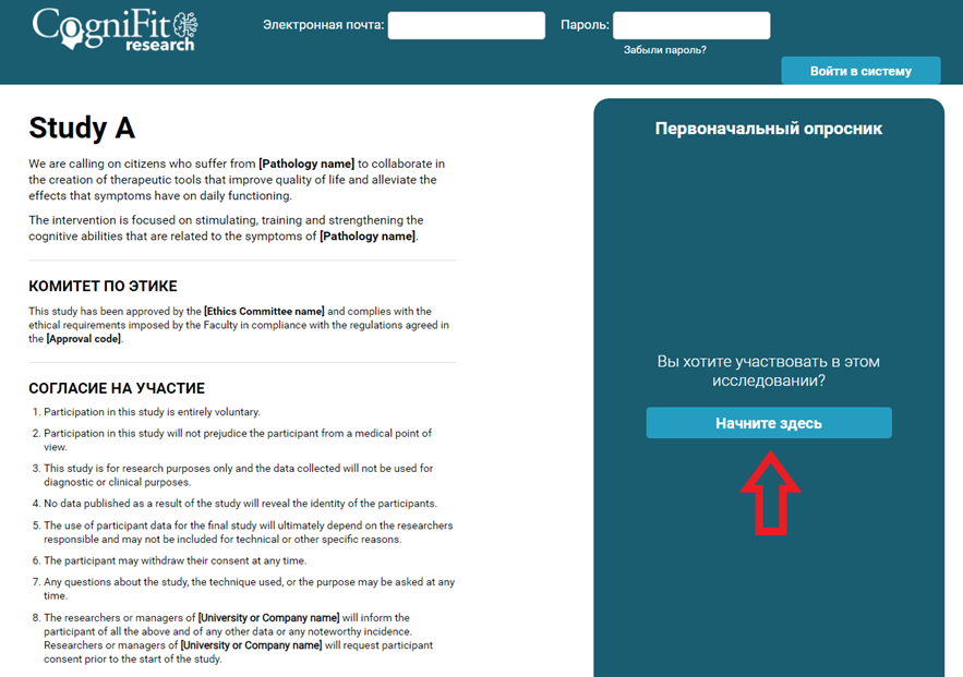 На этой странице вы найдёте информацию об исследовании, этическом комитете, форму согласия и другую важную информацию об исследовании. Если вы заинтересованы в участии в исследовании, нажмите на кнопку «Начните здесь» в правой части экрана.