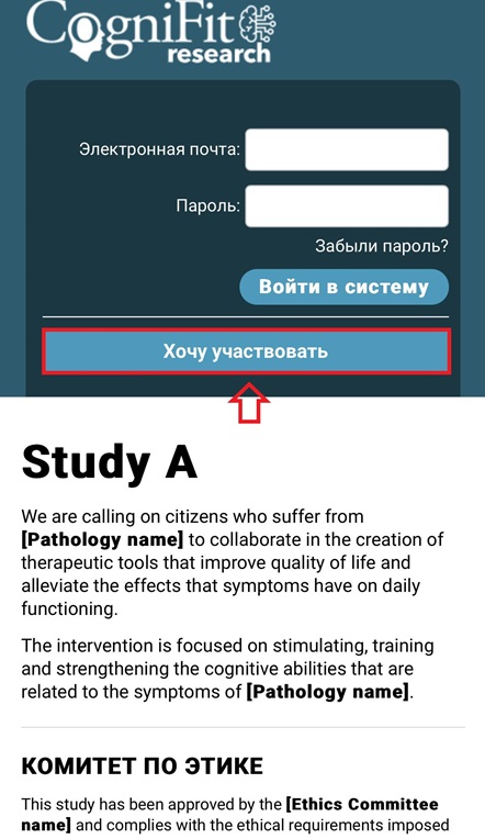 Примечание: Если вы хотите использовать мобильное приложение для выполнения назначенных вмешательств, загрузите приложение CogniFit из App Store, Google Play или AppGallery. Пожалуйста, используйте в качестве имени пользователя тот же адрес электронной почты, с помощью которого вы зарегистрировались в качестве участника исследования. Адрес электронной почты — это единственный способ связать вашу учётную запись участника с аккаунтом исследователя.