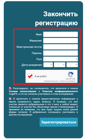 Примечание: Для регистрации в CogniFit в качестве участника исследования мы рекомендуем использовать браузер ноутбука или настольного компьютера. Также можно использовать мобильный браузер. Если вы используете мобильное устройство, мы предлагаем вам воспользоваться мобильным приложением CogniFit для выполнения заданных упражнений. Не забудьте запомнить и сохранить своё имя пользователя и пароль для доступа к CogniFit.