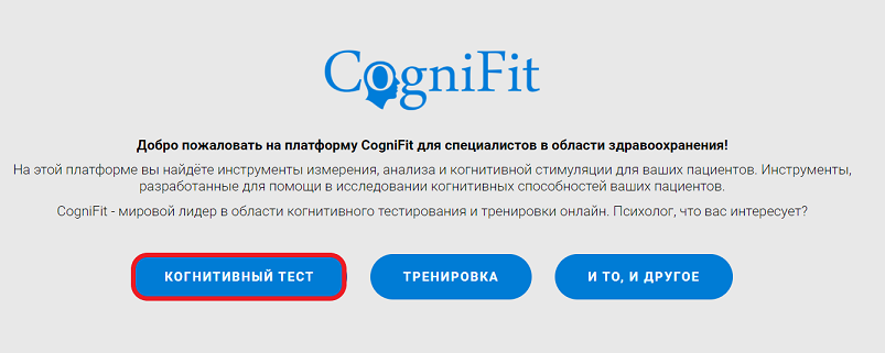 После создания новой профессиональной учётной записи пользователь увидит приветственную страницу. Вы можете приобрести лицензии на тесты, нажав на кнопку «Когнитивный тест«. Лицензия на тест действительна для любого теста на платформе.