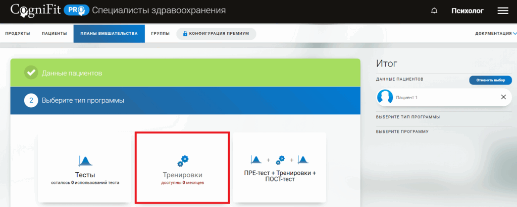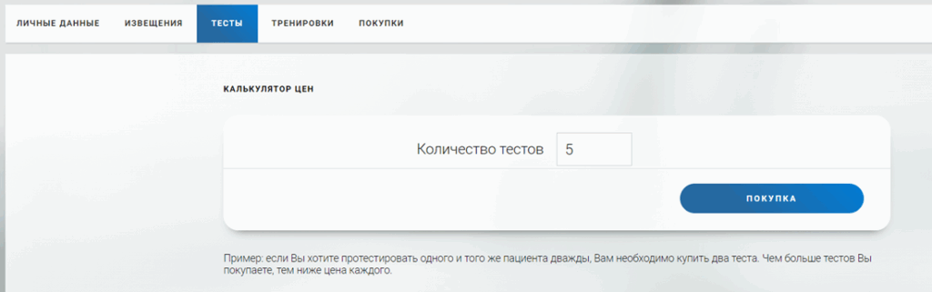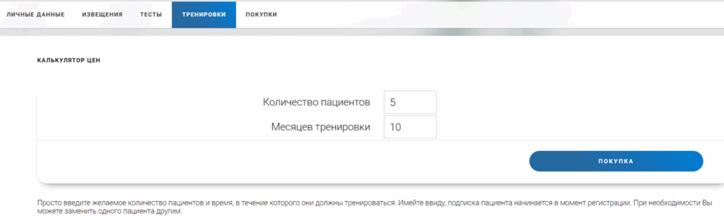 Затем выберите вкладку «Тренировки«. На открывшейся странице введите количество пациентов, число месяцев тренировок и нажмите на кнопку «Покупка«.