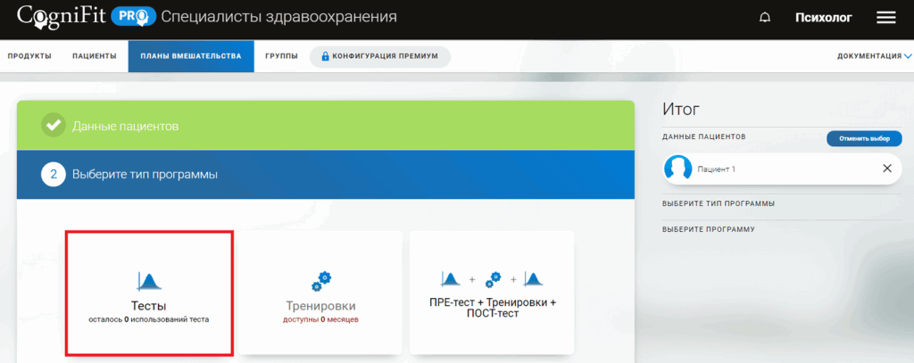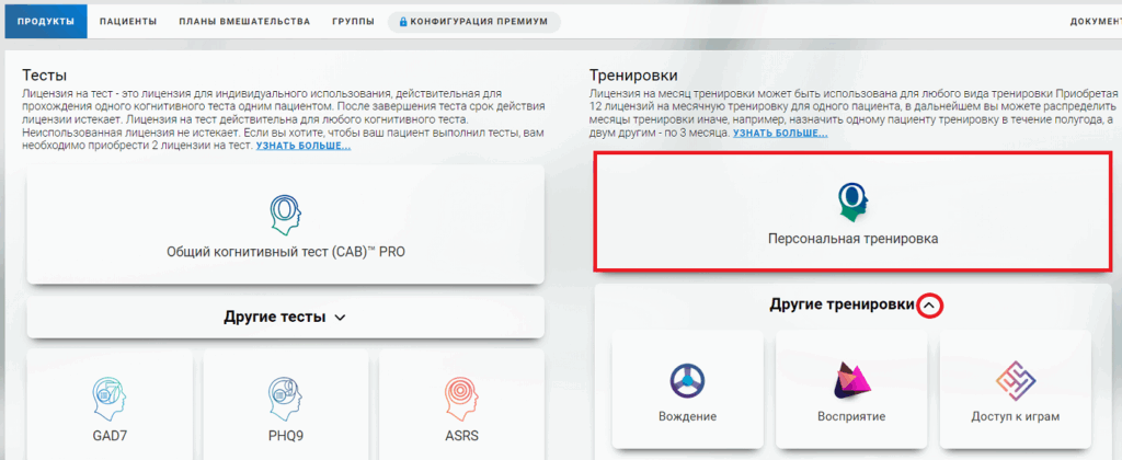 Примечание: Опросники ASRS, GAD 7 и PHQ9, а также базовые когнитивные задачи в разделе тестов доступны бесплатно. Для назначения их пациенту не требуется лицензия.
