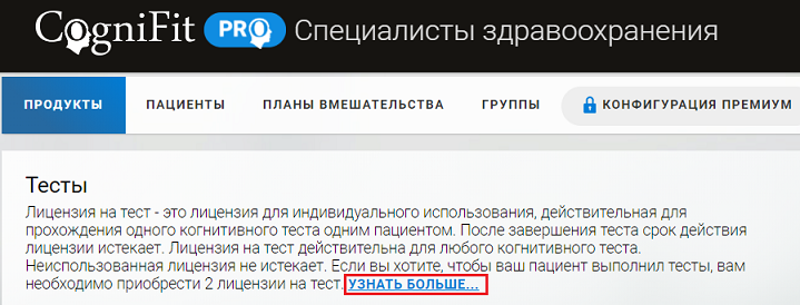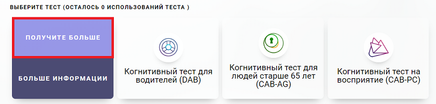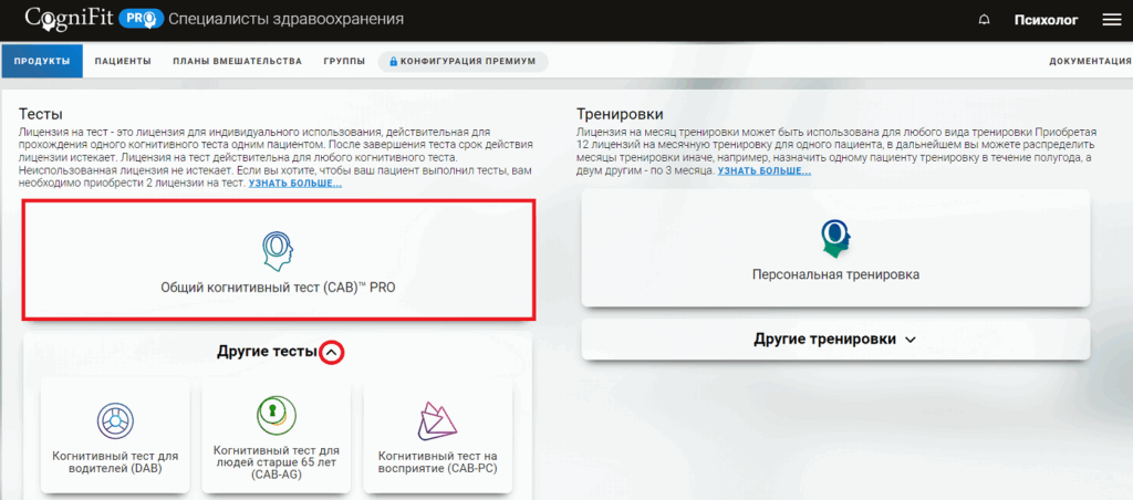 Вы также можете приобрести лицензии в любое время на домашней странице вашей учётной записи. Для этого нажмите на желаемый тест во вкладке «Продукты«. Далее выберите Общий когнитивный тест (CAB)™ PRO или любой другой тест, нажав на стрелку раскрывающегося меню «Другие тесты».