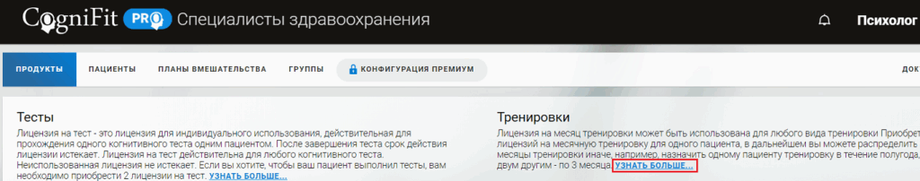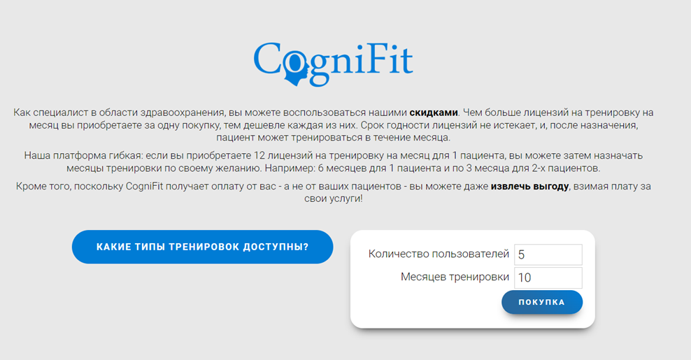 Примечание: Как специалист в области здравоохранения, вы можете воспользоваться льготными ценами. Чем больше лицензий на когнитивные тренировки на месяц вы приобретаете единовременно, тем ниже цена каждой лицензии. Узнайте больше о лицензиях на тренировки