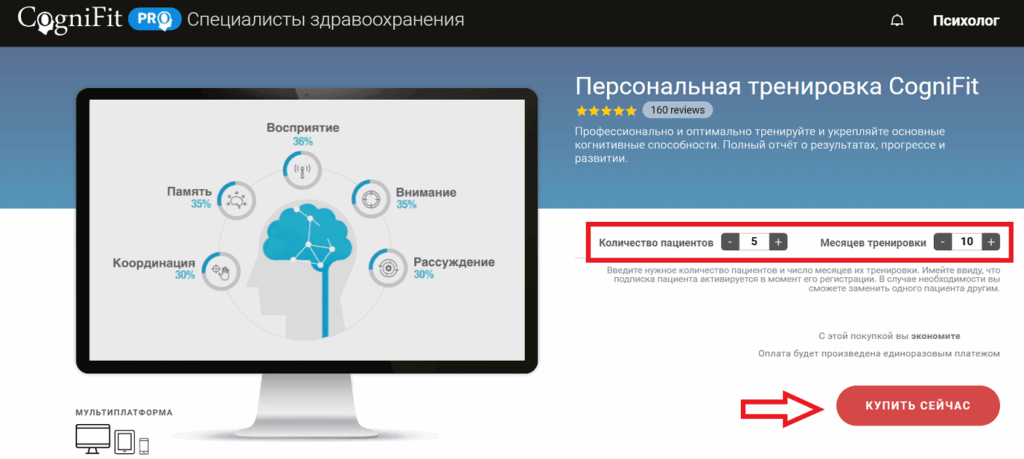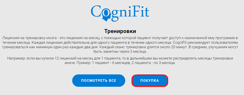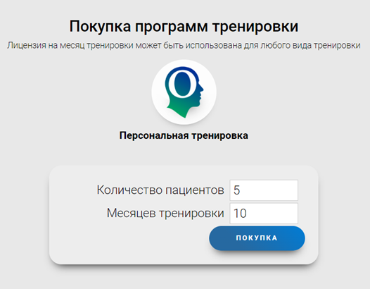 На открывшейся странице введите количество пациентов, число месяцев тренировок и нажмите на кнопку «Покупка«.