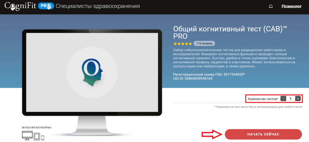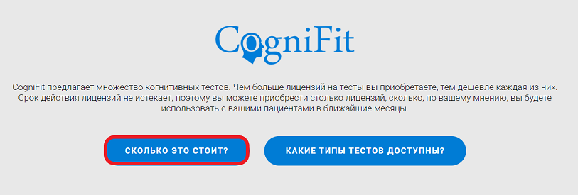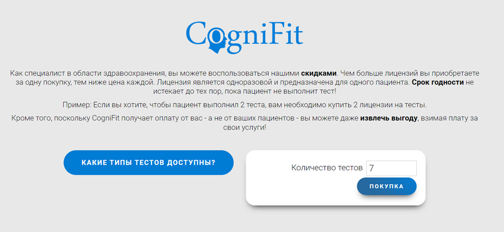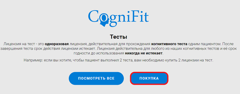 Примечание: Как специалист в области здравоохранения, вы можете воспользоваться льготными ценами. Чем больше лицензий на когнитивные тесты вы приобретаете единовременно, тем ниже цена за каждый тест. Узнайте больше о лицензиях на тесты. Если вы хотите протестировать одного и того же пациента несколько раз, вам нужно приобрести столько лицензий, сколько раз вы планируете провести тестирование.