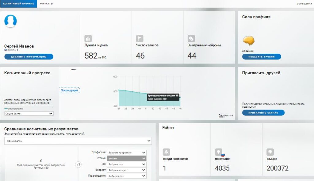 1.2 Далее откроется страница когнитивного профиля. На странице вашего профиля вы можете увидеть вашу позицию в рейтинге, когнитивный прогресс, силу профиля, инструмент сравнения и другую полезную информацию.