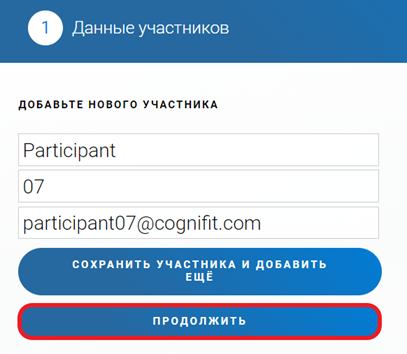 Примечание: Если исследователь хочет добавить более одного участника, он должен ввести данные первого участника и нажать кнопку «Сохранить участника и добавить ещё». Этот процесс можно повторять до тех пор, пока исследователь не добавит всех участников. По окончании нажмите кнопку «Продолжить».