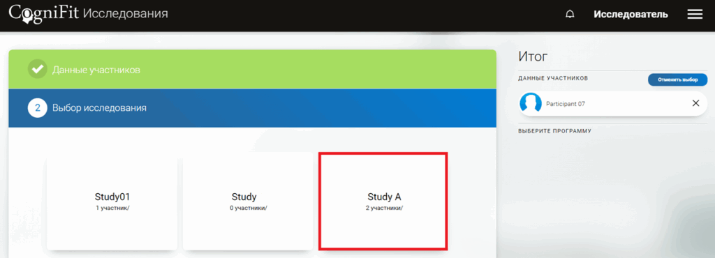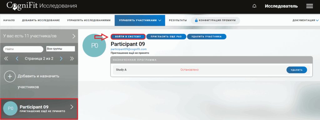 1.3 Добавьте участника в исследование, нажав на название исследования