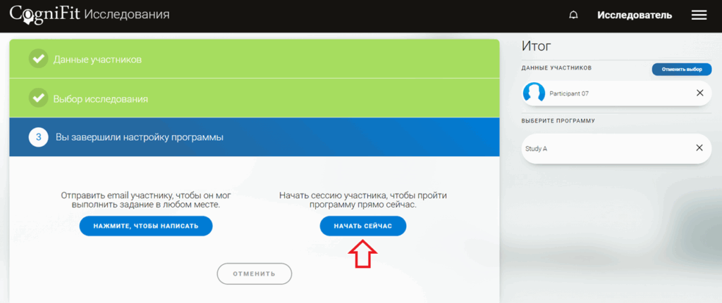 После создания исследования необходимо отправить участникам ссылку-приглашение/приглашение по электронной почте или самостоятельно зарегистрировать участников, чтобы они могли приступить к выполнению назначенных упражнений.