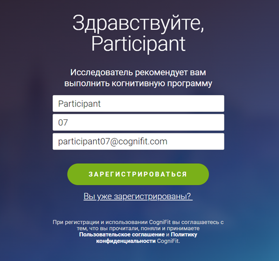 Если исследователь отправил участникам ссылку на исследование или приглашение по электронной почте, этим приглашённым пользователям необходимо пройти процесс регистрации в CogniFit, чтобы начать выполнять задания в рамках исследования.