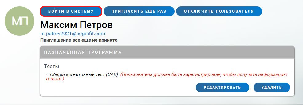 Далее откроется страница профиля пациента. В настоящий момент приглашение всё ещё не принято, так как пациент не зарегистрирован. Проверьте назначенное вмешательство (следуйте этим шагам, если вы хотите изменить назначенную программу) и нажмите на кнопку Войти в систему.