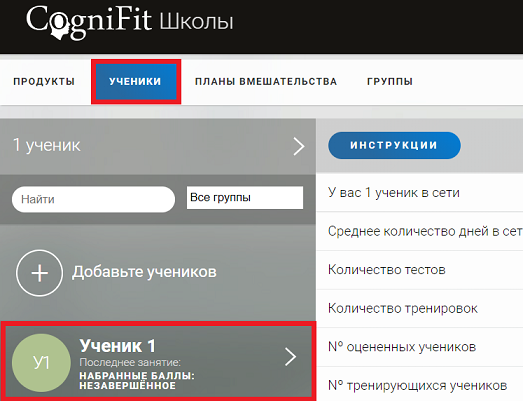 Войдите в свой аккаунт CogniFit для школ и преподавателей, перейдите во вкладку «Ученики» и выберите учащегося, которого вы желаете добавить в группу.