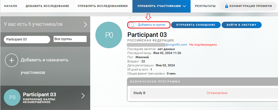 Пригласив участников исследования в CogniFit, вы можете добавить их в группы. Чтобы добавить участника в группу, выполните следующие действия: