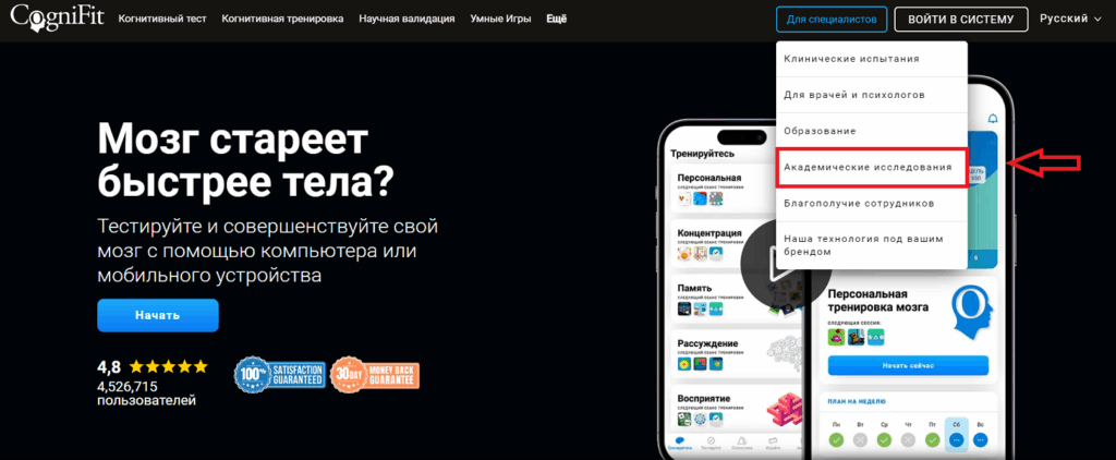 1.1 Чтобы зарегистрироваться на главной странице CogniFit, выберите опцию «Академические исследования» во вкладке «Для специалистов» в верхней части экрана.