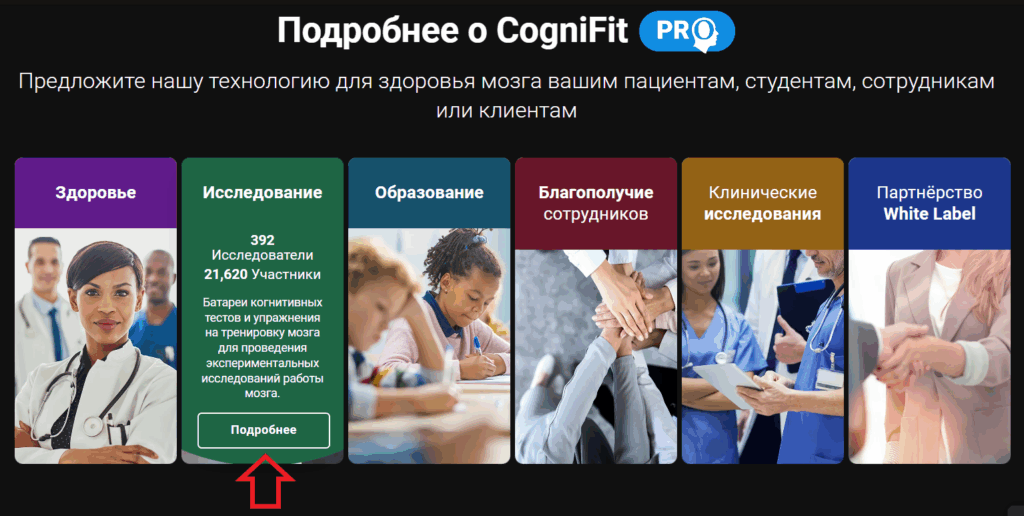 или прокрутите главную страницу CogniFit вниз до раздела «Исследование» и нажмите на кнопку «Подробнее».