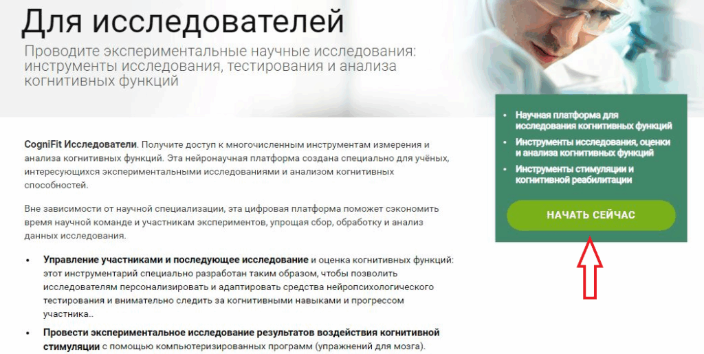 Оба этих способа приведут вас на страницу Исследовательской платформы CogniFit.
