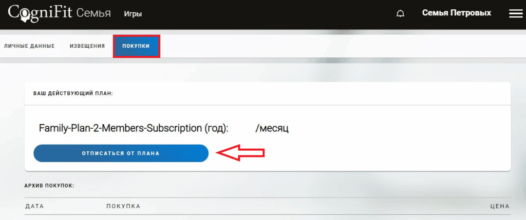 2. На странице настроек аккаунта перейдите во вкладку Покупки. На этой странице вы увидите информацию о текущем плане подписки, который вы приобрели для членов своей семьи. Чтобы отменить подписку, нажмите на кнопку «Отписаться от плана«.