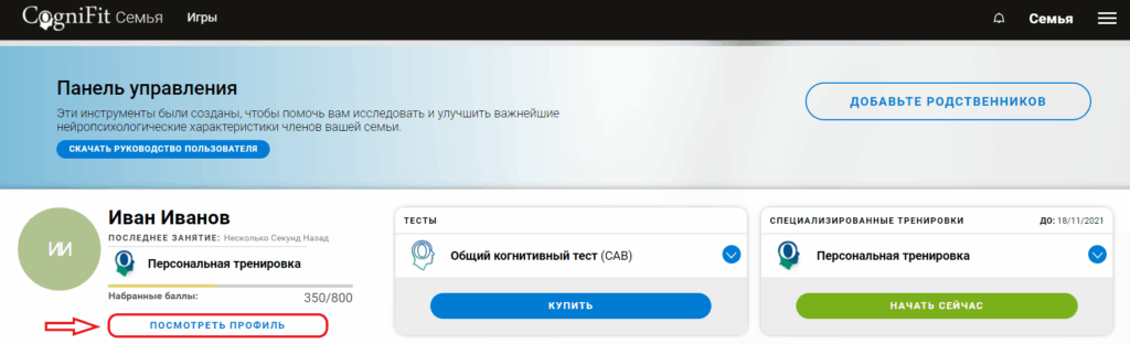 1. Зайдите в свою семейную учётную запись. На главной странице (странице панели управления) выберите члена семьи, отчёт которого о прохождении теста вы хотите скачать, и нажмите на кнопку Посмотреть профиль.