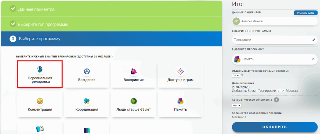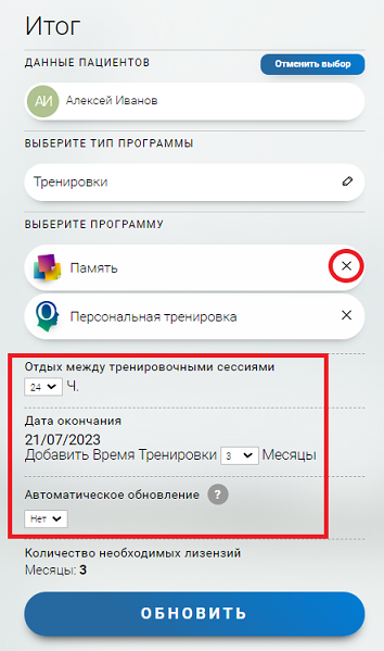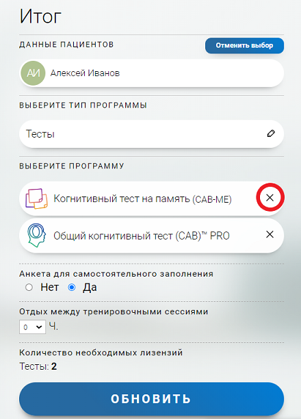 Примечание: если вы хотите просто удалить ранее назначенные пациенту программы, нажмите на кнопку Удалить рядом с Тестами и/или Тренировками.