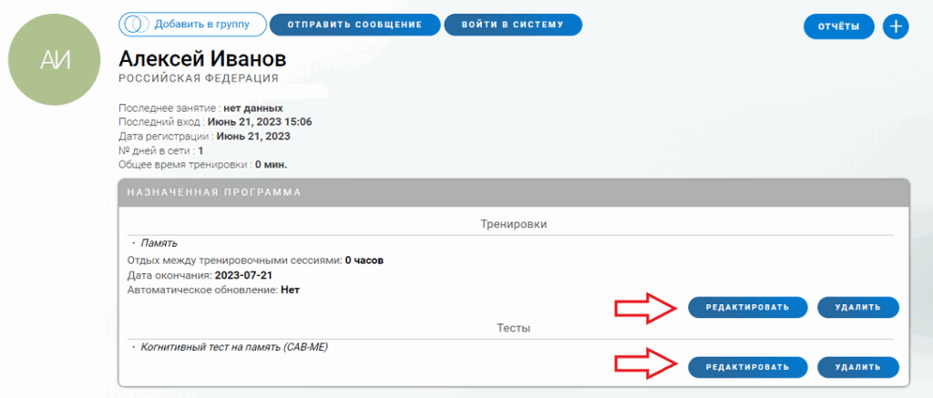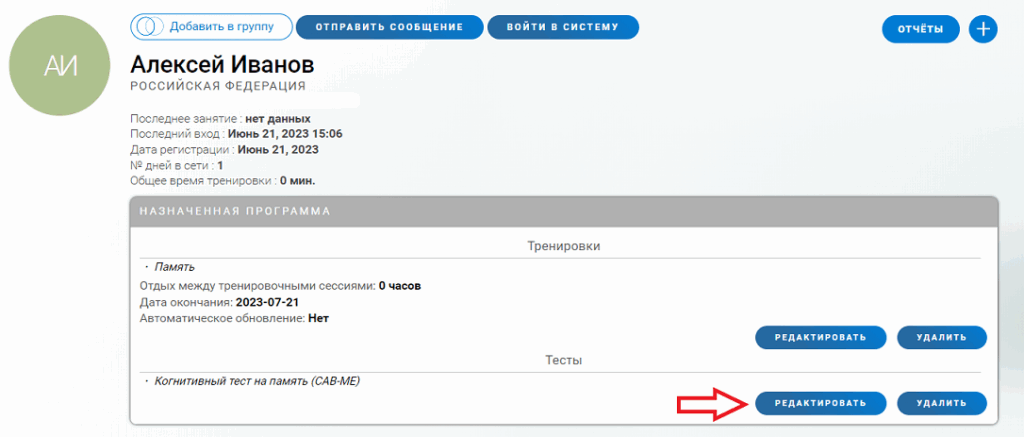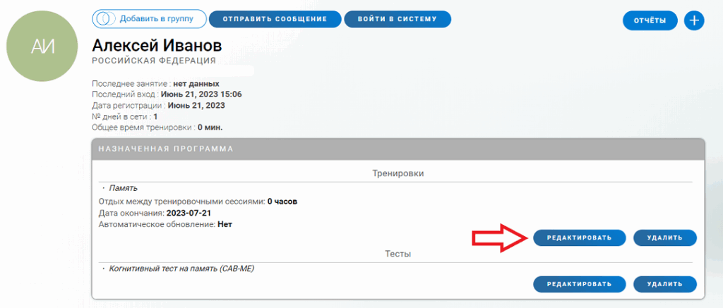 4.2.1 На странице профиля пациента нажмите на кнопку Редактировать рядом с опцией Тренировки.