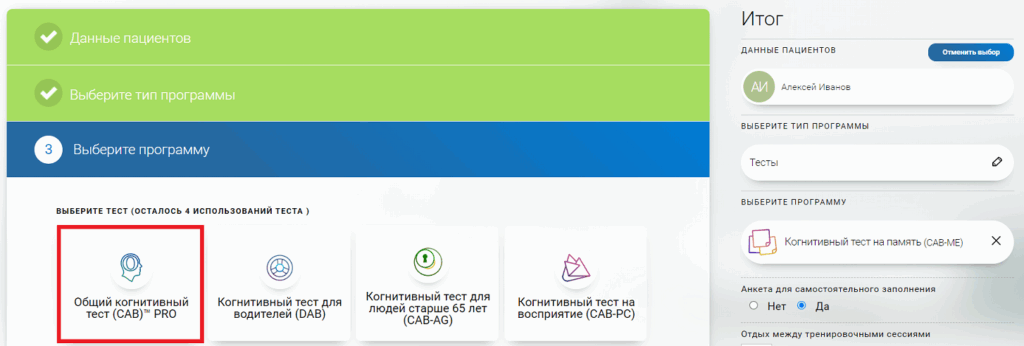 4.1.2 Выберите новый тест, который вы желаете назначить пациенту.
