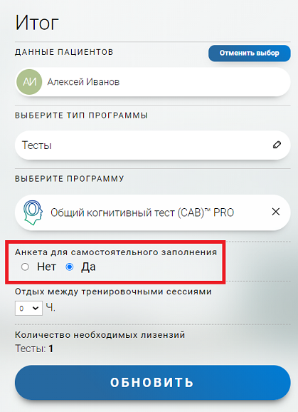 4.1.3 Также вы можете изменить опцию, кто будет отвечать на вопросы анкеты: специалист или пациент. Нажмите на кнопку Обновить.