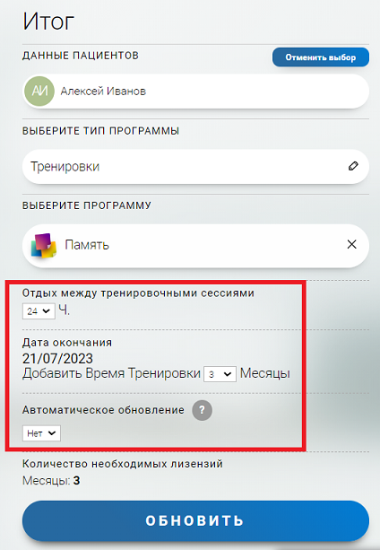 На открывшейся странице вы можете поменять режим тренировки, перерыв между сеансами или функцию автообновления. Специалист может увеличить период тренировки, выбрав необходимое число месяцев в раскрывающемся меню.