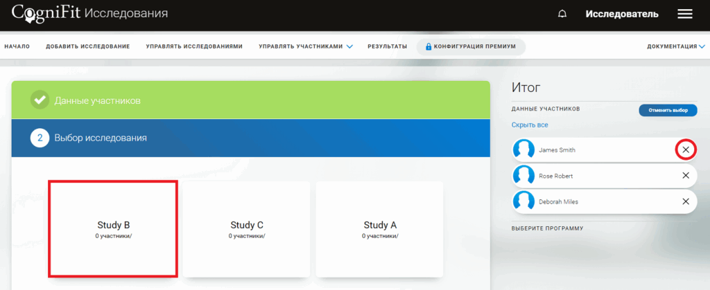 Добавив участника, нажмите на исследование, в котором он будет участвовать.