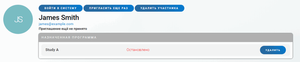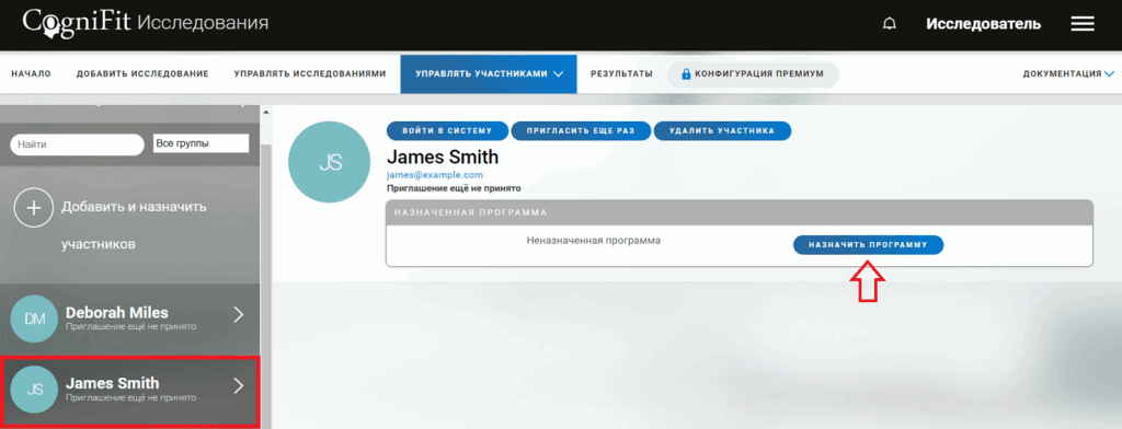 Кроме того, добавить участника в исследование можно через его профиль. Для этого необходимо перейти на страницу участника, кликнуть на его имени и выбрать опцию «Назначить программу».