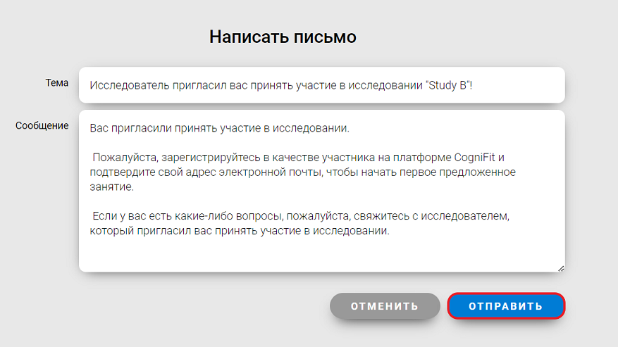 Примечание: При добавлении новых участников в исследование с помощью CSV-списка (а также при добавлении участников исследования, уже зарегистрированных на платформе), после выбора исследования можно будет только отправить приглашение по электронной почте всем участникам.