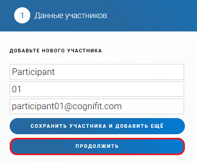 Примечание: Если исследователь хочет добавить более одного участника, ему необходимо ввести данные первого участника и нажать кнопку «Сохранить участника и добавить ещё». Этот процесс можно повторять до тех пор, пока исследователь не добавит всех участников. По окончании нажмите на кнопку «Продолжить».
