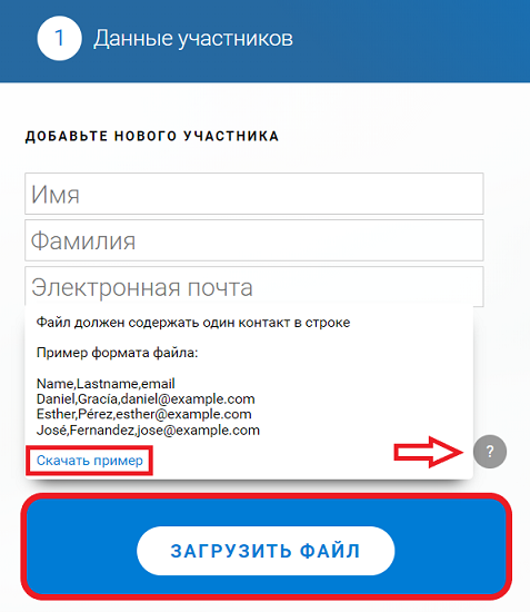 Примечание: В электронной таблице в каждой строке должен быть один участник. Для получения дополнительной информации или загрузки примера исследователь может кликнуть на значок вопросительного знака.