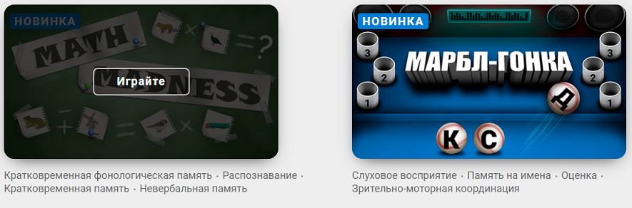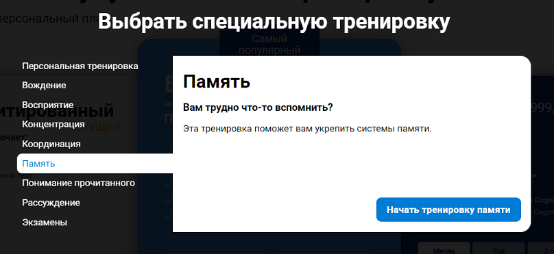 На открывшейся странице выберите другую тренировку, кликнув на её название (в нашем примере — Тренировка памяти), и затем нажмите на синюю кнопку «Начать тренировку памяти«.