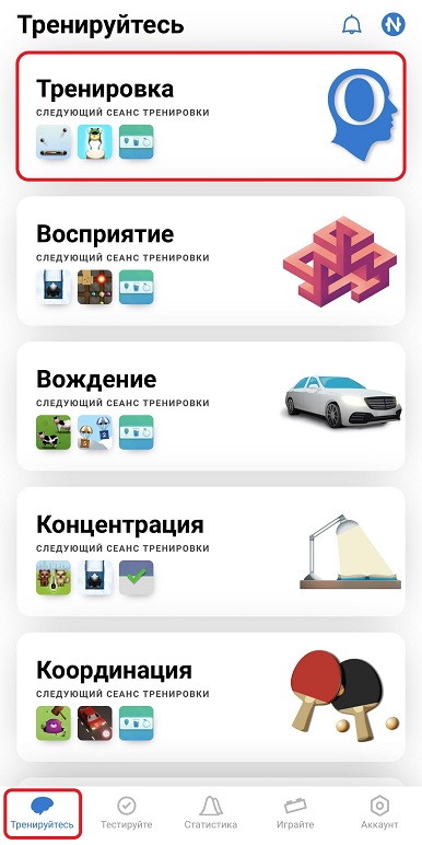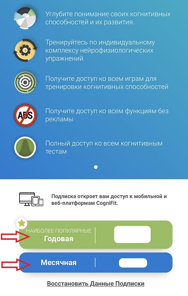 Внимание: Любой тип подписки в приложении (месячная или годовая) даёт вам доступ ко всем тренировкам, имеющимся в приложении, в течение оплаченного периода. Эта опция доступна только для мобильного приложения. Подписка также даёт пользователям доступ ко всем когнитивным тестам. Один и тот же тест можно пройти повторно через 30 дней (при активной подписке).