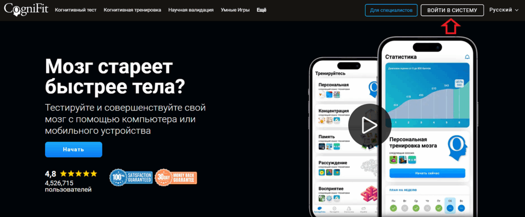 1.1 Нажмите на кнопку Войти в систему на главной странице CogniFit