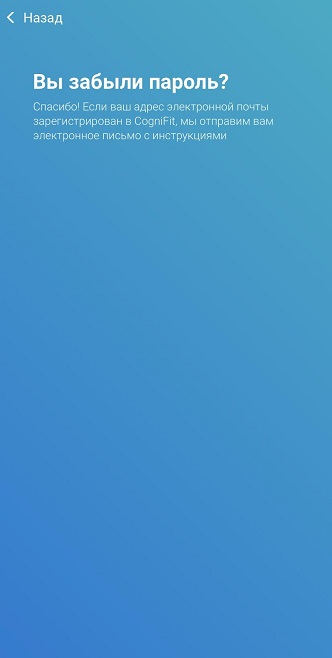 2.4 На ваш e-mail будет отправлено электронное письмо с инструкциями по восстановлению пароля. Убедитесь в том, что для восстановления пароля вы используете тот же адрес электронной почты, что вы зарегистрировали ранее в CogniFit. Если вы не получили письмо, проверьте пожалуйста папку спама или нежелательной почты.