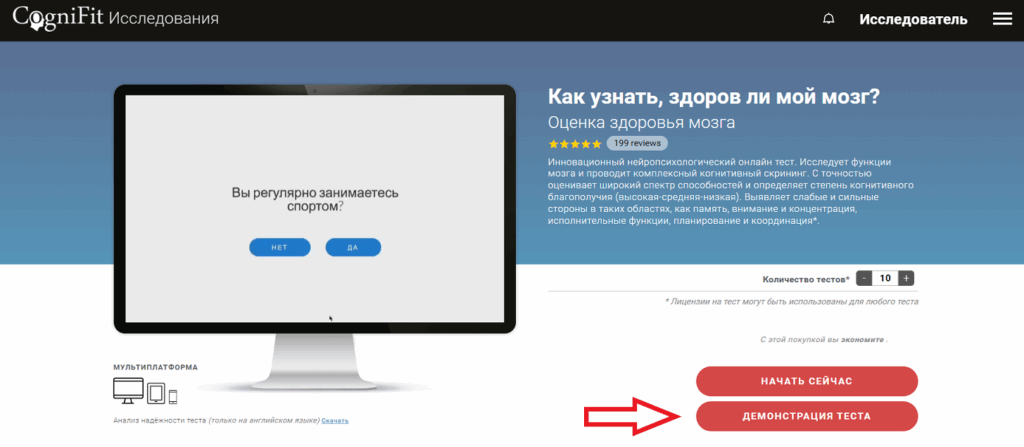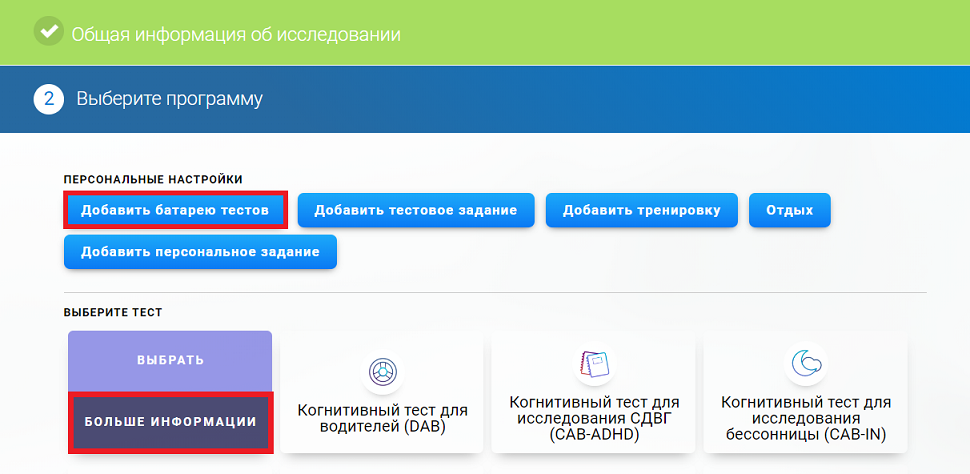 Чтобы получить доступ к демо-версии, начните создавать своё исследование. При выборе батареи тестов (шаг 3.1) нажмите на опцию «Больше информации».