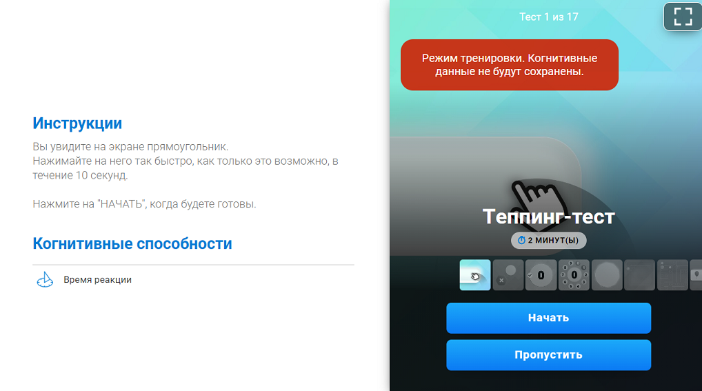 Вы можете пролистать задания до интересующего вас, либо снова вернуться к предыдущим. Следует отметить, что демонстрация служит только для ознакомления с упражнениями. При демонстрации не сохраняются и не регистрируются когнитивные данные.