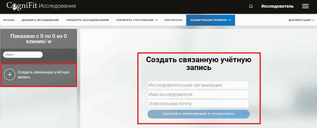12.2 В разделе «Конфигурация премиум» с помощью кнопки «Создать связанную учётную запись» можно приступить к приглашению исследовательских организаций и заполнить данные субаккаунтов. Можно создать новую учётную запись исследователя или использовать уже существующую. Вы можете добавить любое количество субаккаунтов и предоставить им приобретённые лицензии.