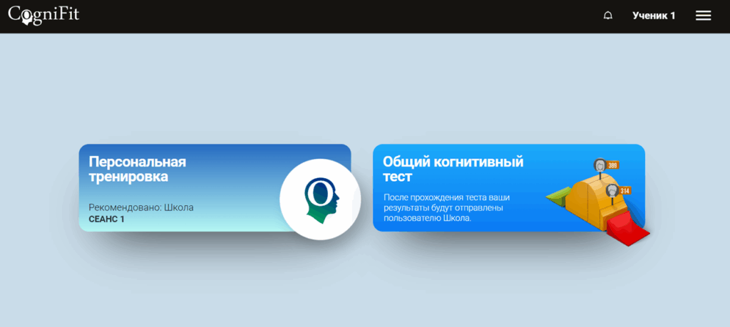 Учащимся необходимо пройти только когнитивное вмешательство, выбранное учителем. Таким образом, интерфейс учётной записи ученика значительно упрощается по сравнению с интерфейсом аккаунта преподавателя или индивидуального аккаунта.