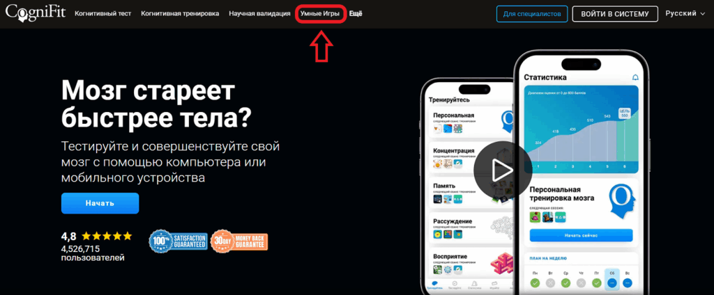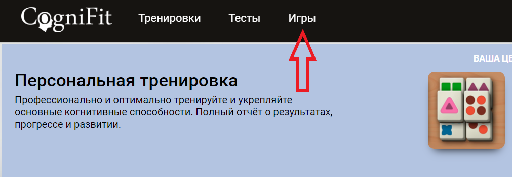 Примечание: Вы также можете получить доступ к играм, выбрав опцию меню «Умные игры» на главной странице CogniFit.