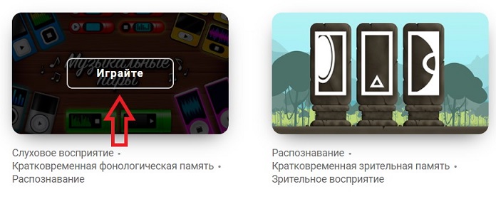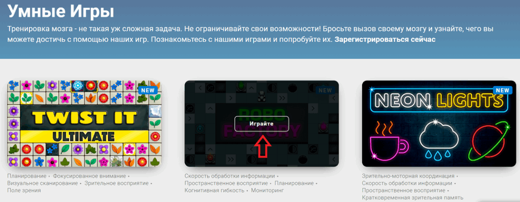 1.2 Откроется страница с нашими играми для мозга. Выберите игру, в которую вы хотите сыграть и наведите на неё курсор мышки. Чтобы начать, нажмите на кнопку Играйте.