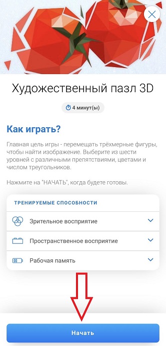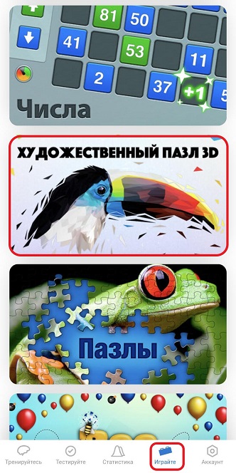 2.1 Зайдите в ваш аккаунт в мобильном приложении и нажмите на значок «Играйте» в нижней части экрана. Откроется страница с нашими играми для мозга. Выберите игру, в которую вы хотите сыграть. Когда будете готовы начать, нажмите на выбранную игру.