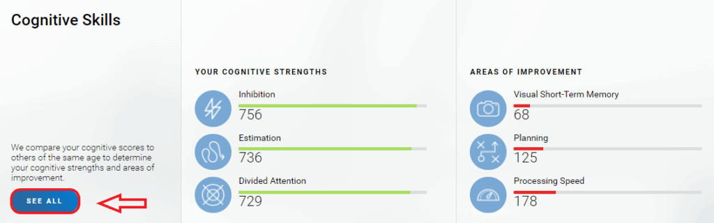 areas of improvement. Click on See All to see more information about your cognitive skills.