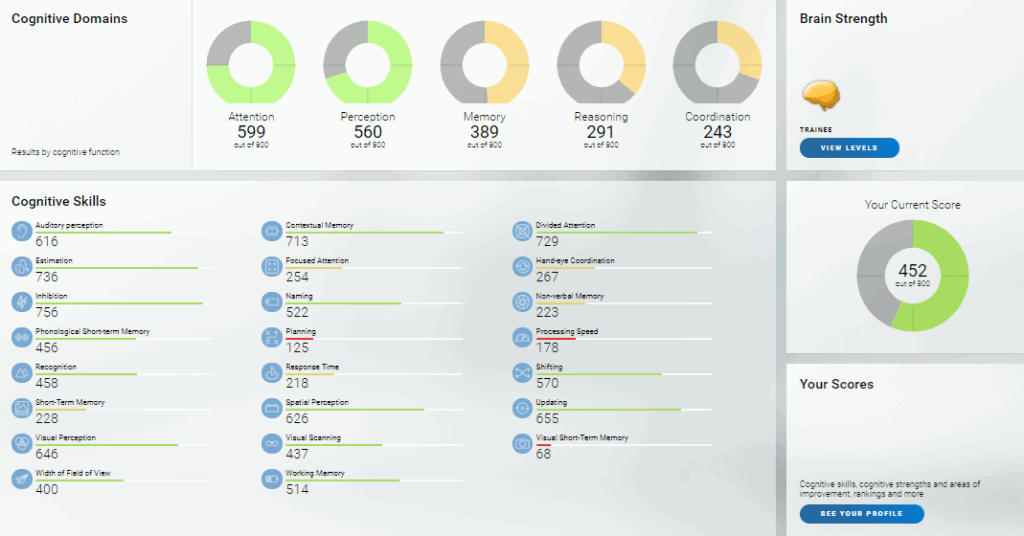 On the page that opens you will see all the current data on the status of your cognitive abilities. Learn more about the CogniFit scoring system.