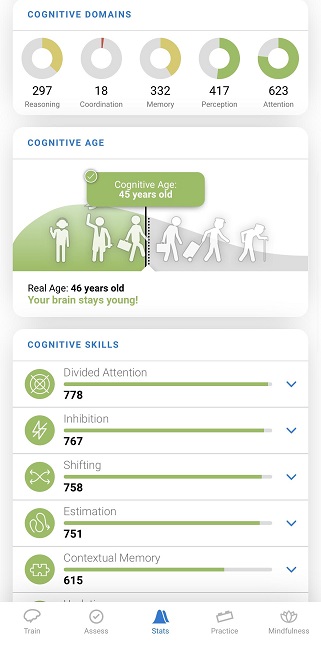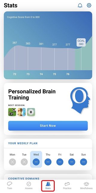 2.2 This screen will show you an overview of your statistics including your Cognitive score, training plan, and moreBy scrolling down, you will see information pertaining to your Cognitive Domains, Cognitive Age and your Cognitive Skills.